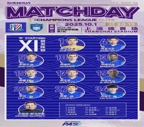 上海申花首發(fā):1-薛慶浩、4-蔣圣龍、5-朱辰杰、10-特謝拉、13-馬納法、15-吳曦、17-高天意、19-阿蘇埃、23-李可、27-陳晉一、34-劉誠(chéng)宇