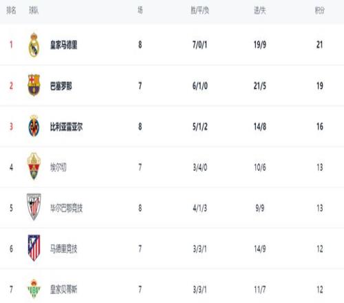 在積分榜上,皇馬暫時(shí)登上了榜首位置?;蜀R拿到21個(gè)積分。而巴薩掉到第2名,只拿到19分。不過(guò),巴薩比皇馬少踢1場(chǎng)。比利亞雷亞爾輸球之后,依然是16分,排名第3。埃爾切和畢爾巴鄂競(jìng)技都是13分,排名第4和第5。馬競(jìng)3勝3平1負(fù),拿到12分,排名第6?;始邑惖偎购臀靼嘌廊艘彩?2分,排名第7和第8。