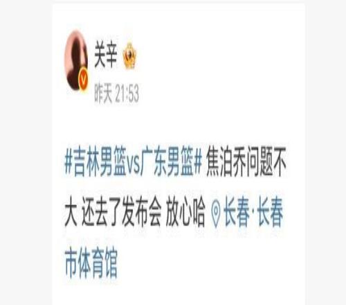下一輪非常關(guān)鍵,對(duì)手將是上賽季的黑馬山西隊(duì)。那么問(wèn)題來(lái)了,受傷的焦泊喬能否出下一輪與山西隊(duì)的比賽嗎?賽后關(guān)辛透露了焦泊喬的情況,他表示“焦泊喬問(wèn)題不大,還去了發(fā)布會(huì),放心哈?!毕乱惠喤c山西隊(duì)的比賽在24日進(jìn)行,廣東隊(duì)有三天的休息時(shí)間,經(jīng)過(guò)三天的休整,應(yīng)該說(shuō)焦泊喬出戰(zhàn)與山西隊(duì)的比賽問(wèn)題不大。
