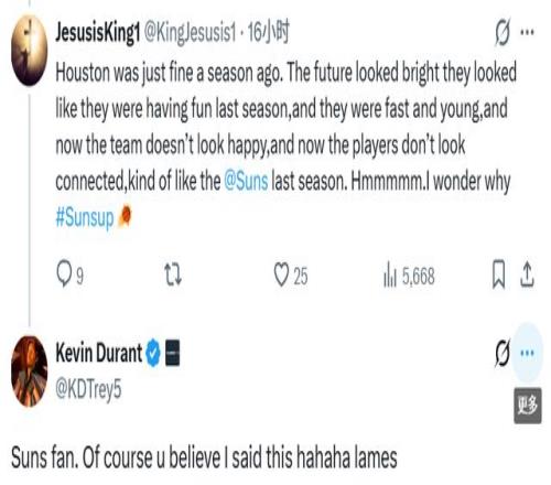 杜蘭特也回復這位球迷:“太陽隊的球迷啊。難怪你會信這種話是我說的,哈哈,真沒勁!”